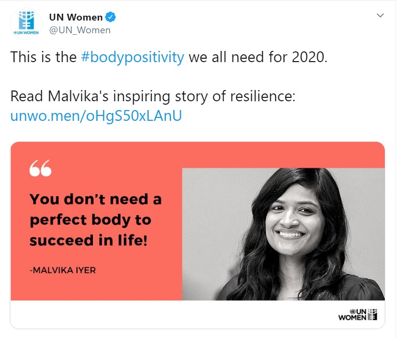 On the occasion of World Disability Day 2019, Malvika tweeted, “17 years ago, when I was lying on the hospital bed, I heard a bunch of women whisper, ‘Did you see that new girl in the general ward? What a shame! She must be cursed as now her life has now come to an end.’ That was the very first time I cried my eyes out. Not when I saw my amputated arms covered in blood. Not when I saw the doctors drilling iron rods inside my leg. Not when I was battling for my dear life. I was labeled the disabled girl with no future. The naive 13 year old mind inside me was ready to believe their verdict on my life and had it not been for the unconditional support of my family and friends, I’d have given up.