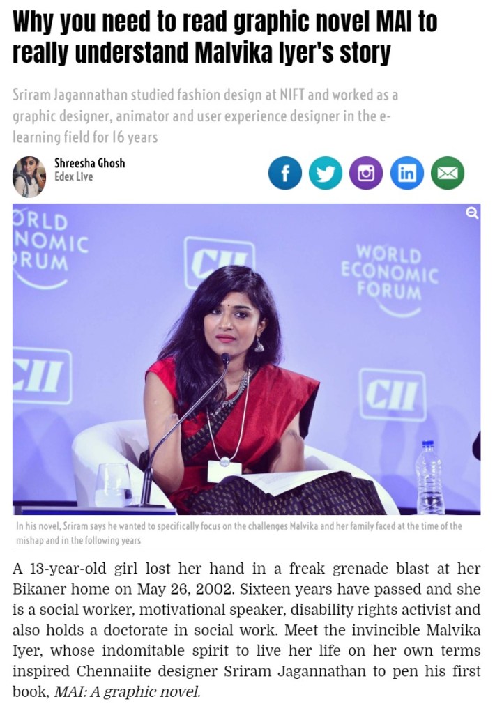 The New Indian Express: Meet the invincible Malvika Iyer, whose indomitable spirit to live her life on her own terms inspired Chennaiite designer Sriram Jagannathan to pen his first book, MAI: A graphic novel.