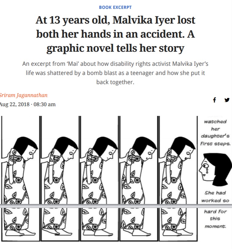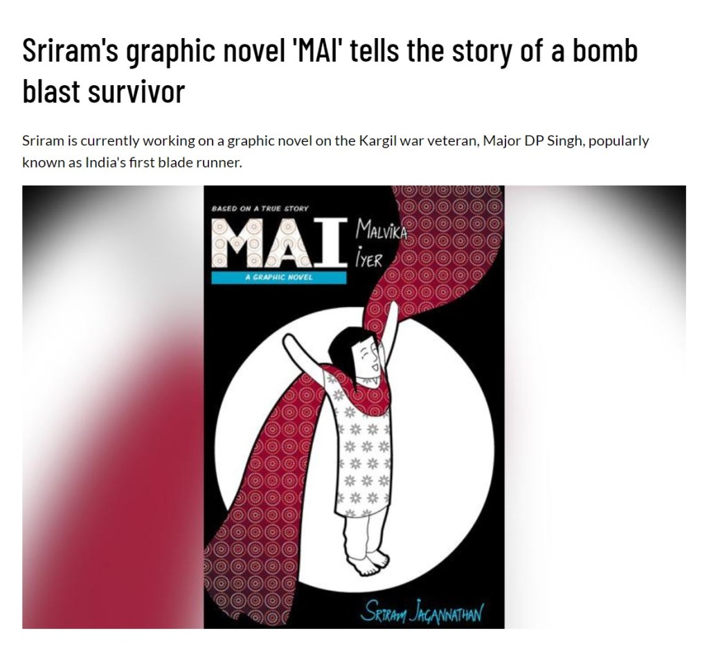 The Times of India: In an interview with The TOI, she said “I identify myself as a survivor. For the last couple of years, I have shared many stories about how I survived the bomb blast and overcame my disability. I have talked about hope and optimism but what I never really shared with you all is what I went through, the despair and hopelessness that engulfed me during the accident. To tone down the despair, Sriram Jagannathan came with an idea of a graphic novel- a series of illustrations narrating my childhood, the accident and my life before and after it. He has done a terrific job with the graphics and I’m thrilled to share the novel with you all”.